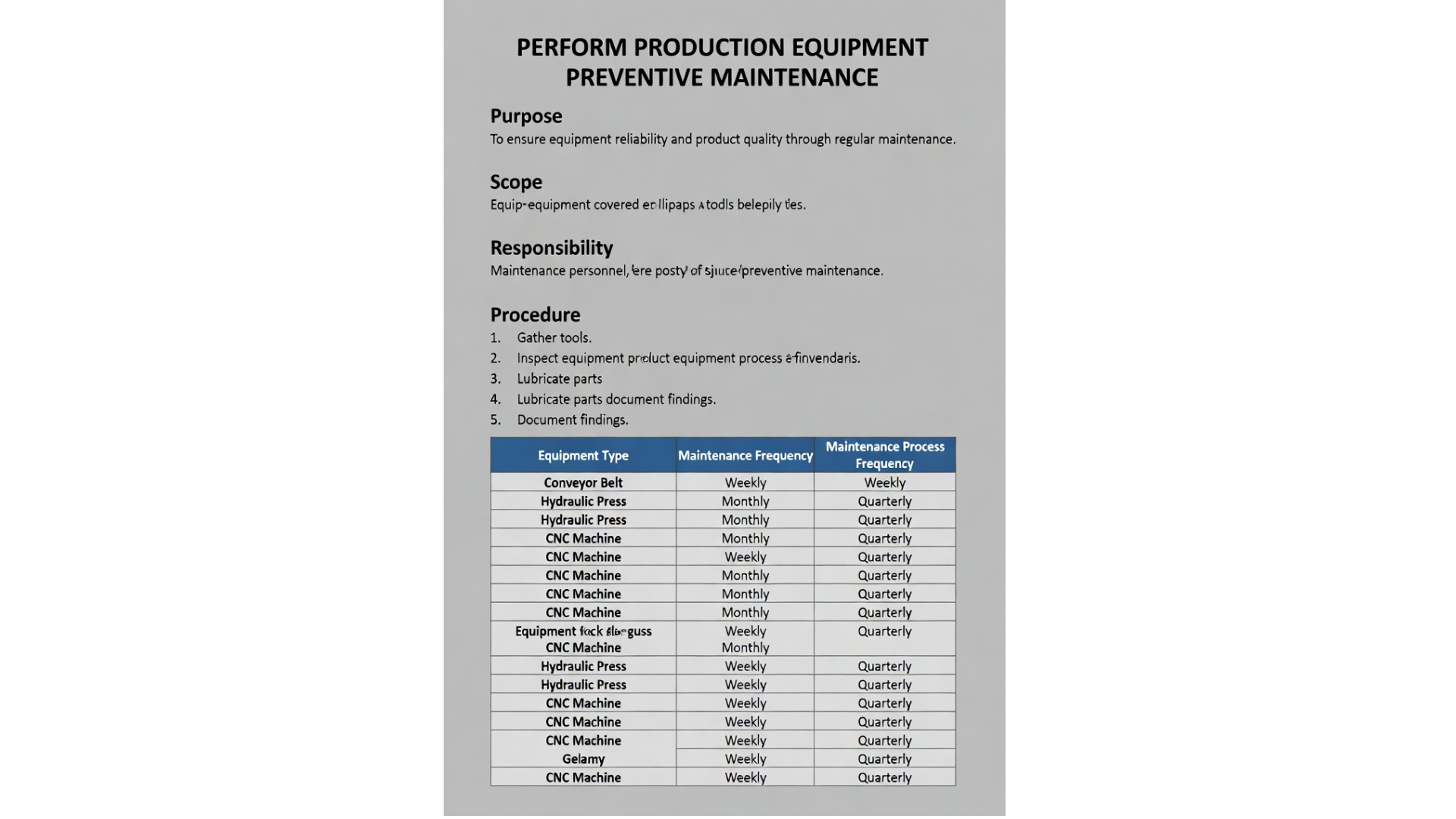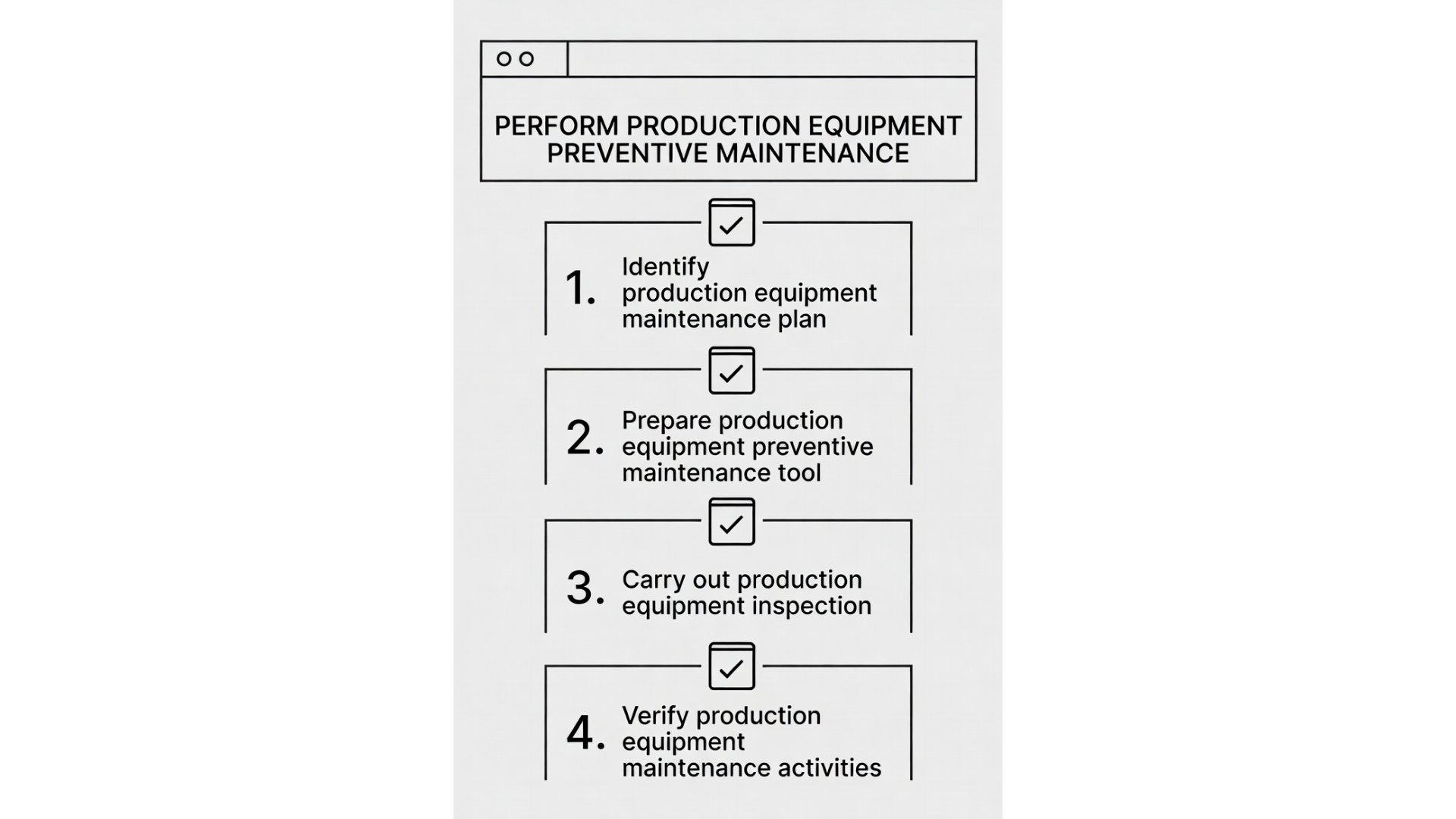 The learning outcomes of this competency are to enable the trainees to carry out production equipment inspection and perform test runs to ensure production equipment is in good condition and subsequently can produce products as customer orders. Upon completion of this competency unit, trainees should be able to: 1. Identify production equipment maintenance plan. 2. Prepare production equipment preventive maintenance tool. 3. Carry out production equipment inspection. 4. Verify production equipment maintenance activities.