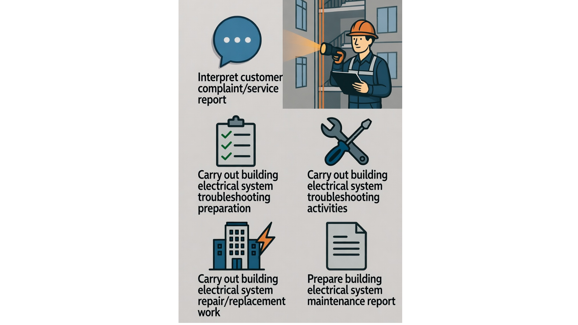 The person who is competent in this competency unit shall be able to schedule, plan, execute and resolve the system fault in accordance to the requirement of building electrical maintenance services and the relevant rules and regulation. Upon completion of this competency unit, trainees will be able to:- • Interpret customer complaint/ service report • Carry out building electrical system troubleshooting preparation • Carry out building electrical system troubleshooting activities • Carry out building electrical repair/replacement work • Prepare building electrical system maintenance report