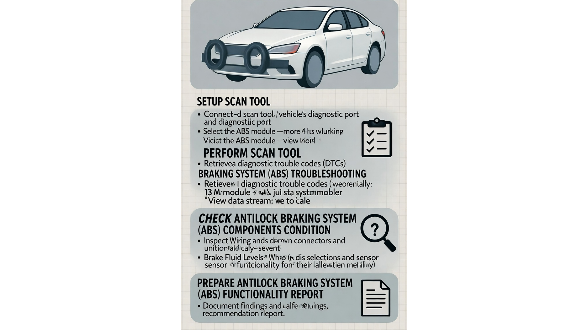 The person who is competent in this CU shall be able to detect malfunctions and defect in ABS and assign the required repair job. Upon completion of this competency unit, trainees will be able to: 1. Setup Scan Tool 2. Perform Scan Tool Antilock Braking System (ABS) Troubleshooting 3. Check Antilock Braking System (ABS) Components Condition 4. Prepare Antilock Braking System (ABS) Functionality Report