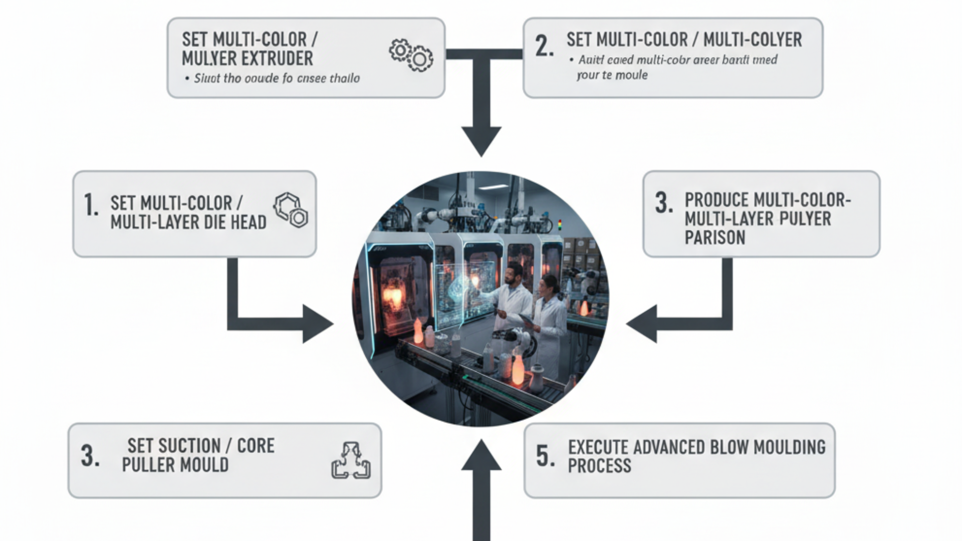 The person who is competent in this competency unit shall be able to ensure every equipment set-up always functions in good condition and performs its required task and its output rate is always in good quality according to machine manual, job/work instructions, Health Safety and Environmental (HSE) requirements as well as company Standard Operating Procedure (SOP).Upon completion of this competency unit, trainees will be able to:- • Set multi-colour / multi-layer extruder. • Set multi-colour / multi-layer die head equipment. • Produce multi-colour / multi-layer parison. • Set suction blow mould / core puller mould. • Execute advance blow moulding process.