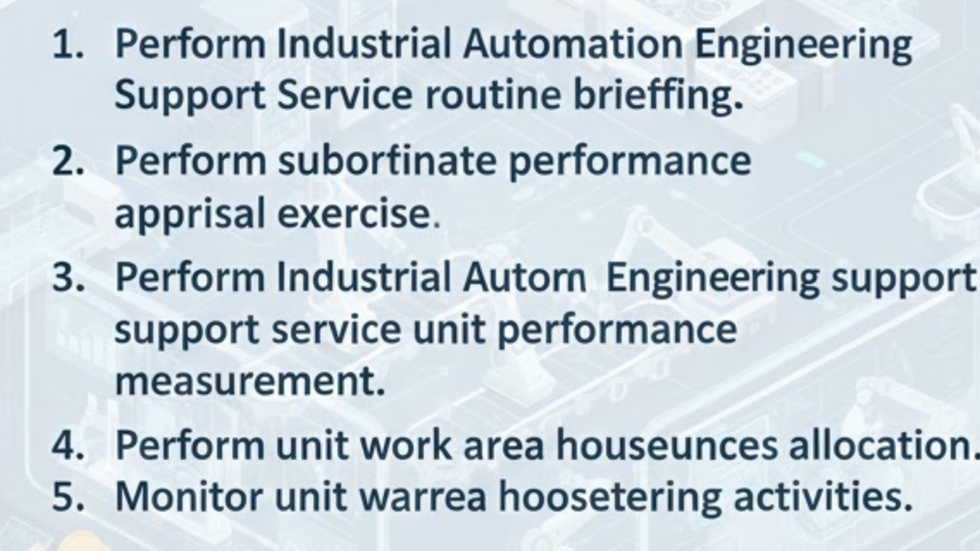 The outcome of this competency is to provide support to his/her superior by conducting briefing, assisting in appraisal, monitoring housekeeping activities, and generating report for briefing, appraisal and housekeeping activities in accordance with the regulatory compliance. Upon completion of this competency unit trainees will be able to: 1. Perform Industrial Automation Engineering Support Service routine briefing. 2. Perform subordinate performance appraisal exercise 3. Perform Industrial Automation Engineering support service unit performance measurement. 4. Perform unit work area housekeeping resources allocation. 5. Monitor unit work area housekeeping activities.