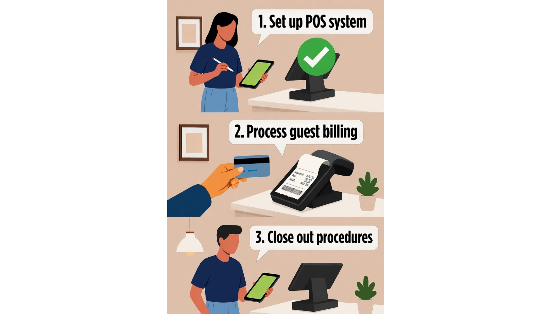 The outcome of this competency unit is to ensure that the POS system is used properly and the bill issued to the guest is accurate according to the order that has been made. Upon completion of this competency unit, trainees shall be able to: 1. Setup POS. 2. Carry out guest billing. 3. Carry out POS closing.