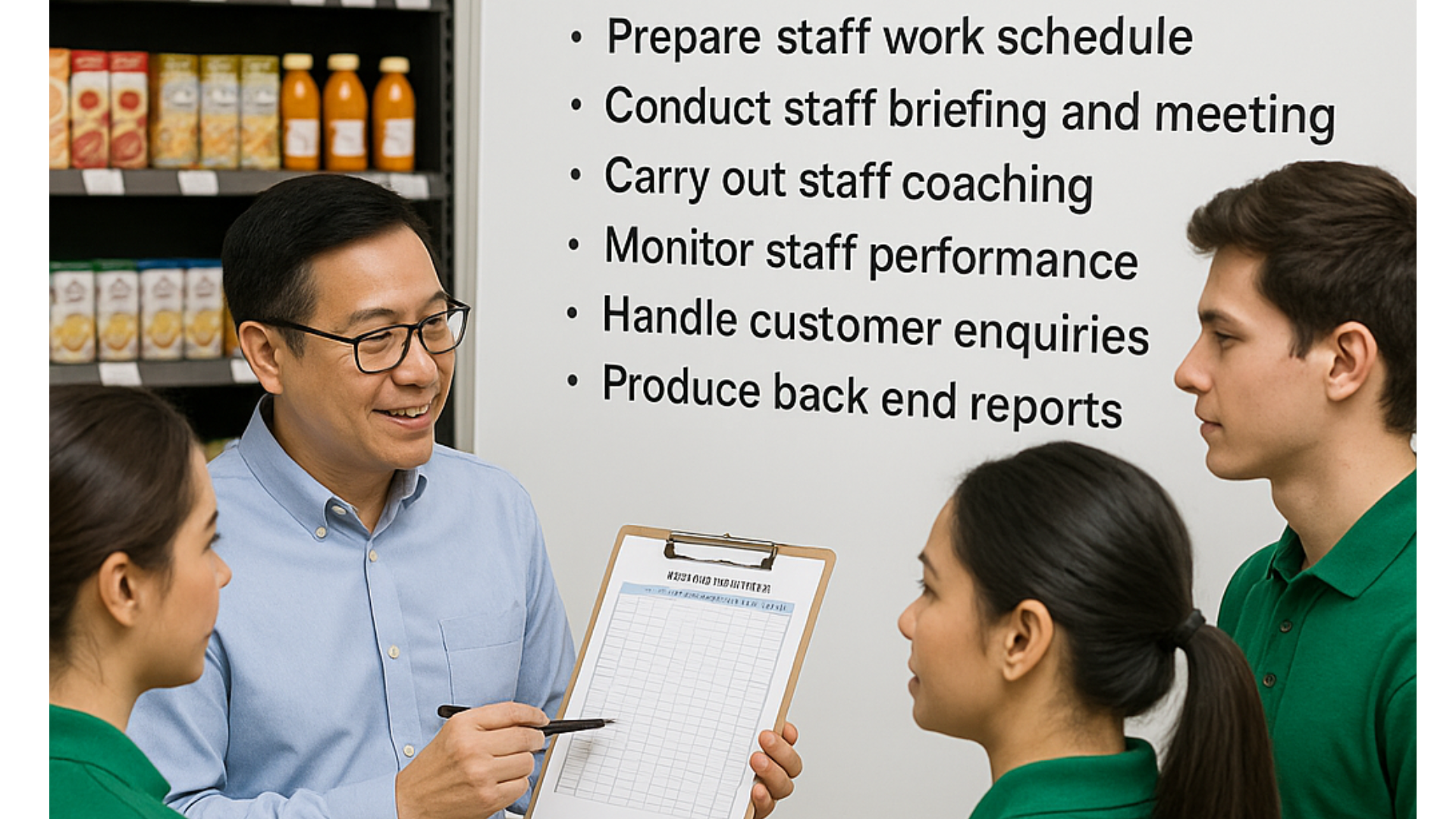 The outcome of this competency unit is to ensure staffs are briefed, coached and monitored according to duty and responsibilities; and retail store rules and regulation. Upon completion of this competency unit, trainees shall be able to: 1. Prepare staff work schedule 2. Conduct staff briefing and meeting 3. Carry out staff coaching 4. Monitor staff performance